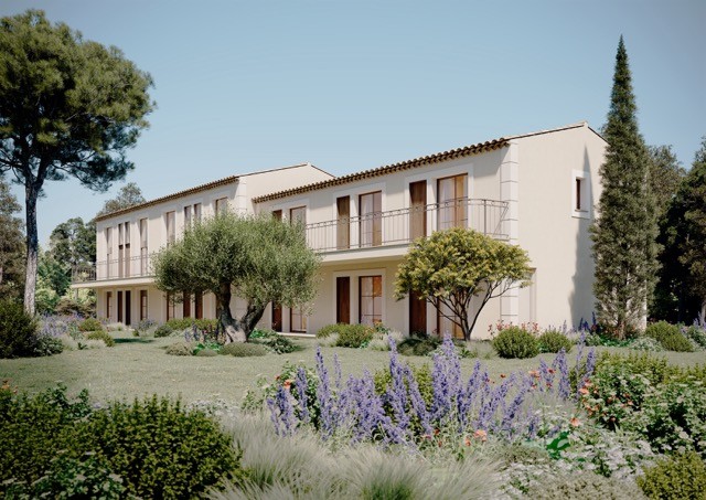 L’écriture architecturale, inspirée des constructions environnantes, mêle enduits clairs et portes en bois. La continuité des ouvertures, du rez-de-chaussée à la mezzanine, rythme la façade. Le jeu de hauteurs différenciées des volumes restitue une écriture proche de celle d’un tissu de maisons de village. À l’extérieur, un aménagement paysager méditerranéen et un salon participent à créer un cadre convivial et confortable pour les habitants saisonniers.