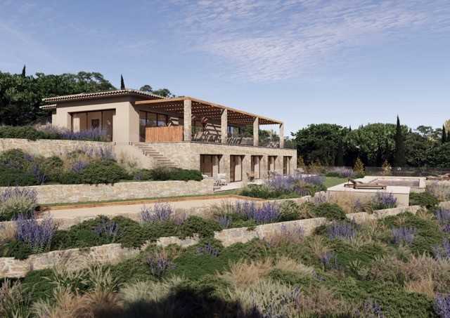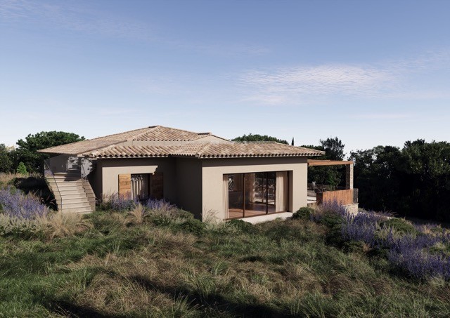 Enfin, une partie de la couverture est traitée en toiture tropézienne, favorisant une intégration douce et respectueuse dans son paysage naturel.